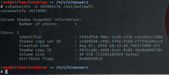 With our VSS image still mounted, we can use vshadowinfo to tell us the date and time the copy was created.