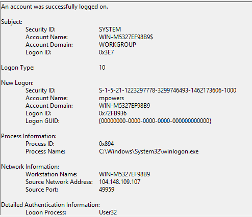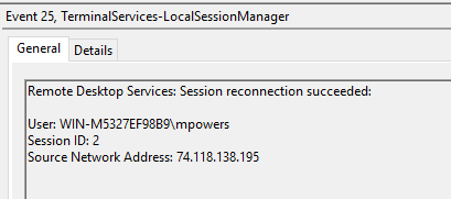 We are going to look at the Microsoft-Windows-TerminalServices-LocalSessionManager%4Operational.evtx log. This event log details the login events after authentication has occured, which you can match with the Security event log. Knowing about when all this activity was occuring, we can see two event log entries for mpowers: one is a new connection, the other is a successful reconnection attempt.