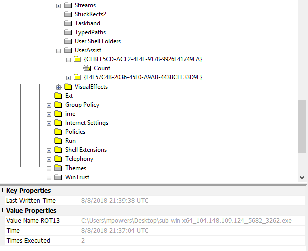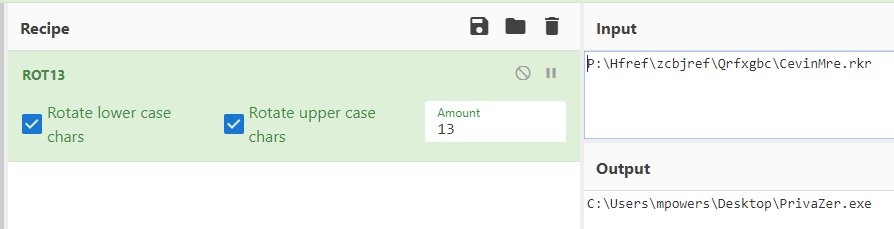 Program execution is also tracked in the UserAssist key. Microsoft thought it would be a good idea to perform a ROT13 on the UserAssist key, so we will need to undo that operation. CyberChef is the best tool to do this. Simply copy the list of applications into the input window, drag the ROT13 operation into the recipe window, then observe the output. As you notice, there is one application that stands out among the rest: PrivaZer. Performing a Google search tells us that we are dealing with a privacy application, with the ability to wipe logs and securely delete files. This seems like a good candidate for our answer.