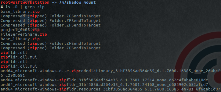 One of the first steps upon obtaining this image was extracting the $MFT. Looking through the $MFT and finding no ZIP files, my next step was to check the VSS image. I ran a ls -R | grep zip and came across some interesting results, namely FileServerShare.zip and project_0x03.zip.
