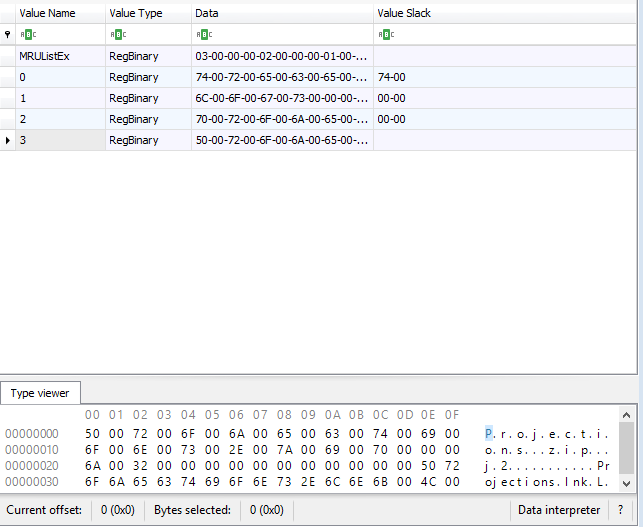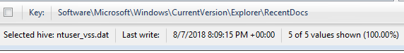 Normally you can view this in the RecentDocs key in the user’s NTUSER.DAT file: NTUSER.DAT\Software\Microsoft\Windows\CurrentVersion\Explorer\RecentDocs. However, this key has been cleaned. As you might have noted from the previous post and answers, when it looks like something has been deleted we turn the the VSS image (if one exists)!