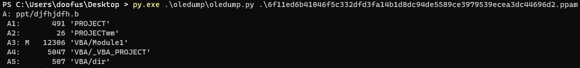 py.exe .\oledump\oledump.py .\6f11ed6b41046f5c332dfd3fa14b1d8dc94de5589ce3979539ecea3dc44696d.ppam