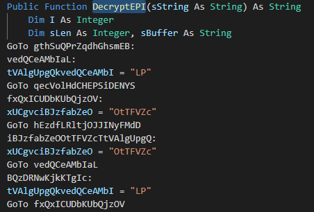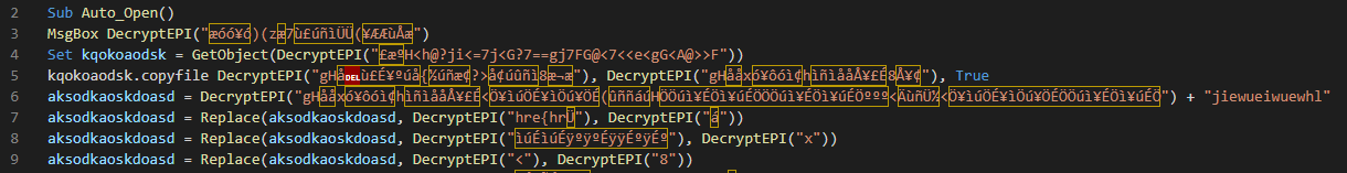 When we open the file, immediately alarm bells go off. This is no ordinary add-in. First, the obfuscation. Second, there is a message box that will appear whose text is decrypted on the fly. Last, there appears to be a lot of decrypted strings. Looking through the Microsoft API, there is no DecryptEPI() function. Which means it must be defined in this script: