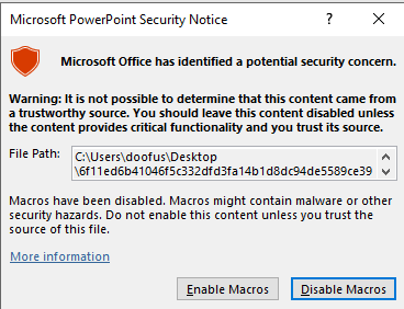 The first pop-up you get when opening the file is Microsoft’s saying that macros have been disabled because the file came from an untrustworthy source. NOTE: NEVER ENABLE MACROS ON A DOCUMENT THAT YOU DO NOT TRUST…